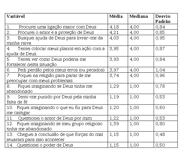 Conforme sugerem os resultados da Tabela 1, no que tange ao CER Negativo, as variáveis mais recorrentes são: Fiquei imaginando se meu grupo religioso tinha me abandonado (1,39); Fiquei imaginando se Deus tinha me abandonado (1,29); Questionei o amor de Deus por mim (1,22); Cheguei à conclusão de que forças do mal atuaram para isso acontecer (1,15) e Questionei o poder de Deus (1,15). Verificou-se que o CER Positivo prevalece em relação ao CER Negativo, isto é, a pessoa idosa busca, por meio da espiritualidade, um relacionamento salutar junto ao transcendente, a fim de resolver seus conflitos. Pargament, Koenig e Perez (2000) assinalam que o CER Positivo e o CER Negativo explicam as correlações existentes. Para eles, quanto maior e intensa for a fé da pessoa idosa institucionalizada, maior será a aceitação, a compreensão e o enfrentamento dos desafios cotidianos.