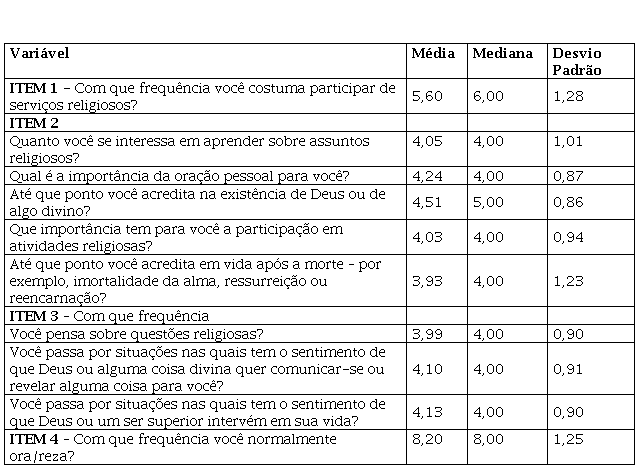 A escala possui 10 itens e foi utilizada com objetivo de verificar se realmente a religiosidade se apresenta como dimensão central na amostra da população idosa analisada. Os parâmetros da ECR são as variáveis: Altamente Religioso (4,0 a 5,0), Religioso (2,1 a 3,9), Não Religioso (1,0 a 2,0). A sistematização da análise dos dados quantitativos foi realizada por meio do programa Statistical Package for the Social Sciences (SPSS 21).