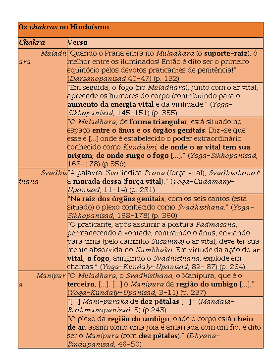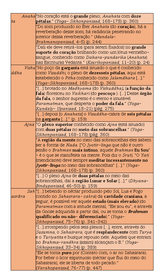 No quadro a seguir, explicito conteúdos de alguns dos Yoga Upanishads que prenunciam sua compreensão sobre os chakras, assinalando por meio de negritos as características encontradas em cada um: