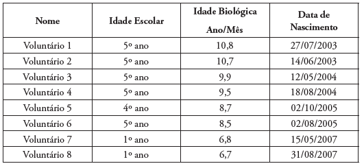 O estudo foi realizado em fase única, no início da intervenção, na qual inicialmente os pais dos voluntários assinaram o Termo de Consentimento Livre e Esclarecido (TCLE), declarando conformidade com a participação no estudo. Foram obtidos os dados da criança como data de nascimento e a série escolar.