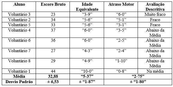 Para o escore bruto os participantes apresentaram uma média de 32,87 pontos sendo que os valores desta avaliação se encontram entre 0 e 48 pontos. A média da idade equivalente dos participantes é de 5,37 anos e a idade de atraso motor para os participantes apresentou uma média de 2,75 anos. Estes resultados demonstram o atraso motor das crianças com TDAH quando comparados aos dados normativos.