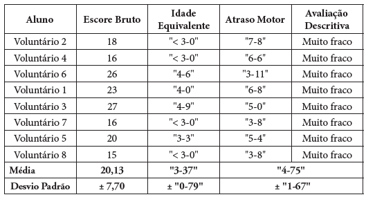 Em relação aos valores do subteste de controle de objetos todos os participantes apresentaram uma avaliação do desenvolvimento motor muito fraca (Tabela 4). A média do escore bruto foi de 20,12 pontos sendo que os valores desta avaliação se encontram entre 0 e 44 pontos. A média da idade equivalente dos participantes foi de 3,37 anos e a média do atraso motor foi de 4,75 anos.