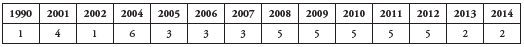 Ao todo foram mapeados 50 estudos que resultaram em tese e abordam o processo educacional das pessoas com deficiência visual no Brasil. No entanto, o recorte temporal do mapeamento se definiu após o término da coleta do material, ficando entre 1990 e 2014, ano da defesa da tese mais antiga e das mais recentes. No Quadro 1 apresentamos a distribuição das teses mapeadas pelo ano de defesa.