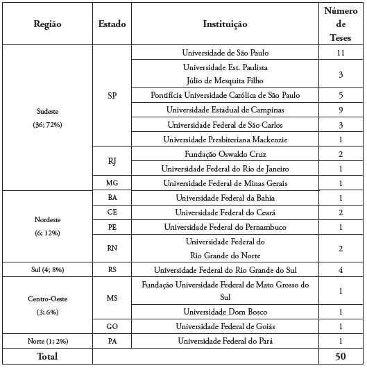 Apesar de sabermos que as teses não representam toda a produção na temática delimitada, as produções dos programas de Pós-graduação strito sensu emergem dos elos entre pesquisadores experientes e iniciantes, que atuam em diversas instituições por todo o país. Com isso, investigam a temática em diferentes contextos e expressam uma diversidade de olhares (TEIXEIRA; MEGID NETO, 2002), constituindo, de certa forma, uma amostra representativa do que é pesquisado nessa temática e, consequentemente, esboçando um panorama do que tem sido feito nessa área no Brasil, como é objetivo desse trabalho.