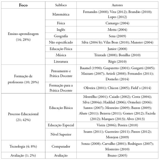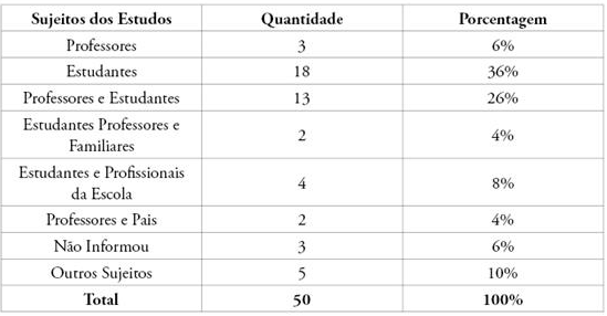 No que ser refere aos sujeitos envolvidos nas pesquisas, percebemos que estudantes foram ouvidos e investigados em pelos menos 74% dos estudos mapeados. Os professores foram a segunda categoria de sujeitos mais investigados. Esses números fazem sentido porque estudantes e professores são os principais personagens no meio educacional. Conforme pode ser evidenciado na Tabela 1, em pelos menos 36% das pesquisas esses sujeitos, professores e estudantes foram ouvidos/investigados simultaneamente. Há também estudos como o de Faciola (2012) e Bazon (2006) que, além de estudantes e professores, envolveram também familiares dos estudantes.