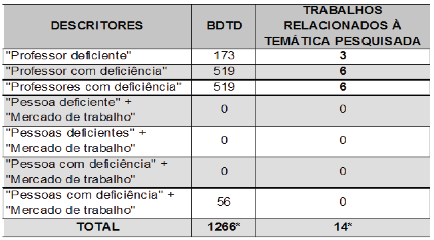 Nos demais quatro descritores pesquisados: “Pessoa com deficiência” e “Mercado de trabalho”, “Pessoas com deficiência” e “Mercado de trabalho”, “Pessoa deficiente” e “Mercado de trabalho” e “Pessoas deficientes” e “Mercado de trabalho”, apenas com o descritor “Pessoas com deficiência” e “Mercado de trabalho” encontraram-se resultados. Desses 56 trabalhos encontrados, nenhum se relacionava com a temática pesquisada.