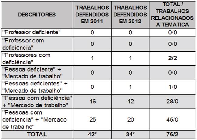 Banco de Teses da CAPES (disponível em: . Acesso em: 15 nov. 2015). Dados sistematizados pelo autor.Das consultas realizadas com os descritores “Professor com deficiência”, “Professor deficiente” e “Pessoa deficiente” e “Mercado de trabalho”, não foram encontrados resultados. Com os descritores “Pessoa com deficiência” e “Mercado de trabalho”, “Pessoas com deficiência” e “Mercado de trabalho” e “Pessoas deficientes” e “Mercado de trabalho”, foram recuperados resultados, mas nenhum referente à temática pesquisada. Já com o descritor “Professores com deficiência”, foram encontrados dois trabalhos referentes à temática de interesse.