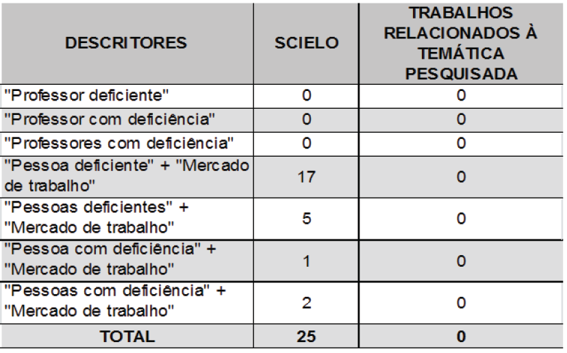 SCIELO – Scientific Electronic Library Online (disponível em: . Acesso em: 17 nov. 2015). Dados sistematizados pelo autor.Na pesquisa com os descritores “Professor com deficiência”, “Professores com deficiência” e “Professor deficiente”, não foram encontrados resultados. Com os descritores “Pessoa com deficiência” e “Mercado de trabalho”, foram encontrados cinco artigos; com “Pessoas com deficiência” e “Mercado de trabalho”, dezessete artigos; com “Pessoa deficiente” e “Mercado de trabalho”, um artigo; e com “Pessoas deficientes” e “Mercado de trabalho”, dois artigos. Quanto à temática relacionada, mais uma vez se confirmou que trabalhos na área sobre o professor com deficiência são poucos, já que nenhum desses artigos se relacionava à temática pesquisada.