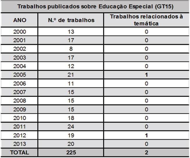 Realizou-se a busca na Associação Nacional de Pós-graduação e Pesquisa em Educação (ANPED), a fim de encontrar estudos realizados pelos Programas de Pós-Graduação em Educação, pesquisando as publicações no respectivo Grupo de Trabalho sobre Educação Especial (GT15) e iniciando a busca na 23ª Reunião Anual (2000), por ser a mais antiga disponível no site da Associação, não estando disponíveis as reuniões anteriores, até a 36ª Reunião Anual (2013).