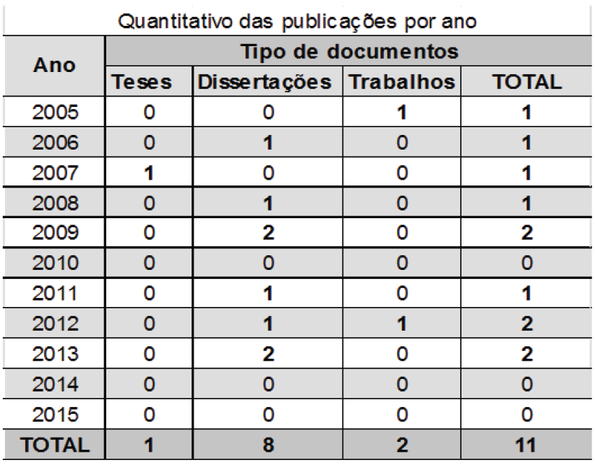 O levantamento das produções realizadas na BDTD, Banco de Teses da CAPES, SCIELO e no Grupo de Trabalho sobre Educação Especial da ANPED demonstrou que, de um total de aproximadamente1 1592 publicações encontradas, entre Teses, Dissertações, artigos e trabalhos (ANPED) no período entre 1990 e 2015, apenas onze trabalhos remetem a pesquisas sobre o professor com deficiência, sendo oito dissertações, uma tese e dois trabalhos do GT15 da ANPED, todos de programas de Pós-Graduação em Educação. Sobre a periodicidade das publicações, temos a primeira publicação no ano de 2005 e as demais nos anos seguintes, com exceção do ano de 2010, 2014 e 2015, em que não houve publicações, e destacando-se os anos de 2009, 2012 e 2013, com duas publicações. Na Tabela 5 há o demonstrativo desses dados.