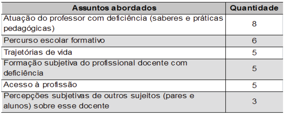 Dados sistematizados pelo autor.Dentre os conteúdos tratados, destaca-se primeiramente a Atuação do professor com deficiência (saberes e práticas pedagógicas). Investigaram-se quais são as práticas pedagógicas adotadas por esses professores, relacionando essa prática com os saberes adquiridos e os desafios enfrentados na prática docente. Salienta-se que nessas pesquisas, seguindo-se as falas dos autores, independentemente da deficiência, os professores realizavam uma prática pedagógica satisfatória ao ensino ministrado. Em segundo lugar, o assunto mais presente nessas pesquisas é o Percurso escolar formativo, descrevendo-se não apenas o período escolar no ensino superior, mas, em algumas pesquisas, toda a fase educacional vivenciada pelos participantes. Em terceiro, quarto e quinto lugar, os assuntos mais presentes são Trajetórias de vida, Formação subjetiva desse profissional e Acesso à profissão, demonstrando a história de vida desses professores, sua constituição subjetiva, sua formação de identidade pessoal e profissional e suas dificuldades e barreiras enfrentadas para inserir-se no mundo do trabalho e desenvolver o trabalho docente. Em penúltimo lugar, o assunto menos abordado foi as Percepções subjetivas de outras pessoas (companheiros de trabalhos e alunos) para com esse docente. Segue a Tabela 7 para ilustrar as informações.