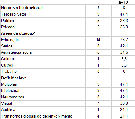 Dos 19 representantes institucionais que participaram da pesquisa, a maioria 73,7% (ƒ=14) exerce função de direção, incluindo vice e auxiliar. Prevaleceram instituições pertencentes ao segmento do terceiro setor, de acordo com o relato dos representantes institucionais. Referente às áreas de atuação, verificou-se que a área de educação prevaleceu sobre as demais, totalizando 73,7% (ƒ=14) das instituições. Quanto ao tipo de deficiência apresentada pela população atendida pelas instituições, houve predomínio das múltiplas deficiências, deficiência intelectual e deficiência neuromotora. Os dados referentes à classificação das instituições conforme a sua natureza, as áreas de atuação e os tipos de deficiências da população atendida pelas instituições são apresentados na Tabela 1.