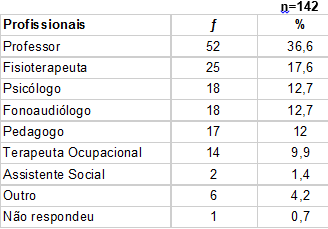 Em relação ao nível de escolaridade 78,9% (ƒ=112) possuíam especialização, 16,9% (ƒ=24) graduação e 3,5% (ƒ=5) mestrado. Quanto à especialidade dos profissionais prevaleceu o professor, com 36,6% dos profissionais, conforme apresentado na Tabela 2.