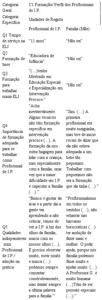 Como já foi referido, a análise de conteúdo foi o método de análise de dados selecionado para examinar os resultados obtidos através das entrevistas. Deste modo, foram elaboradas tabelas que se encontram divididas por categorias gerais (C1 a C3) que dizem respeito aos temas gerais abordados nas entrevistas e por categorias específicas (Q1 a Q17), as quais vão ao encontro ao tema abordado em cada questão. Por ser turno, as unidades de registo referem-se às respostas efetuadas por cada entrevistada, designadas por “Profissional de I.P.” e “Família (Mãe)”.