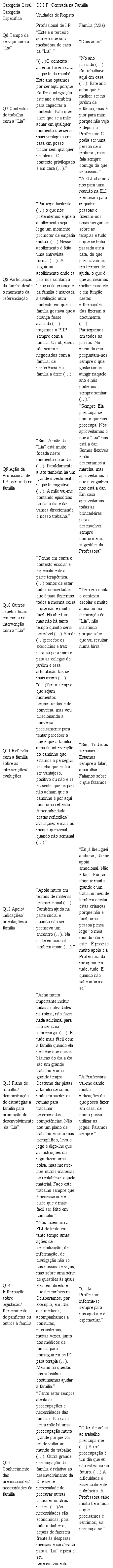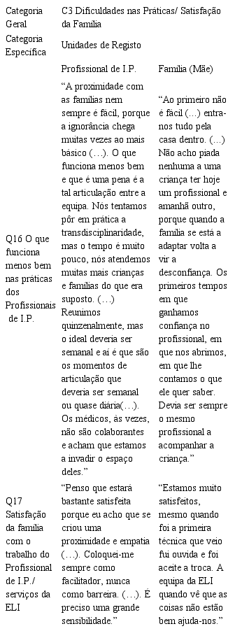 A análise da Tabela 3, cuja categoria geral se intitula “C3 Dificuldades nas Práticas/ Satisfação da Família” permite constatar o que funciona menos bem nas práticas dos Profissionais de I.P. e a satisfação com o trabalho da Profissional de I.P./serviços da ELI.