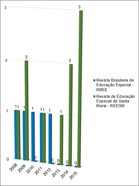 Conforme indicam os dados apresentados no Gráfico 1, em oito anos de publicações da RBEE e da REESM foram localizados 15 artigos implicitamente relacionados ao tema. Nos anos de 2010 e 2012 não foi identificada a ocorrência de publicações na REESM que guardassem relação com a temática em questão, semelhantemente ao que ocorreu nos anos de 2013, 2014 e 2015 na RBEE.