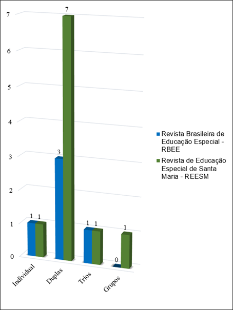 Na revista RBEE foram identificados artigos tanto com autoria individual, quanto em duplas ou em trios, do tipo relato de pesquisa, enquanto que na REESM foram localizados artigos publicados individualmente, em duplas, trios e em grupos com mais de três autores, provenientes de pesquisas de trabalhos de conclusão de curso (TCC), de mestrado e de doutorado. O único artigo em grupo identificado, com mais de três autores, foi publicado nesse periódico, proveniente da junção de pesquisadores da saúde e da educação visando à educação inclusiva, com foco na educação especial (ZILLY et al, 2015). Cabe destacar que a prática de publicação em grupo, com mais de três autores, é muito frequente na área da saúde, fato que pode ter corroborado para a ocorrência desse tipo de autoria e parceria.