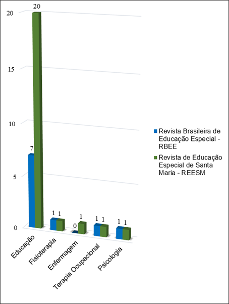 A análise acerca da área de formação dos autores e coautores das publicações pesquisadas revelou o predomínio da formação em educação, representado por 27 (79,42%) dos autores somando as duas revistas; seguida da formação em Fisioterapia, com dois (5,88%) autores; Terapia Ocupacional, com dois (5,88%) autores; Psicologia, também com dois (5,88%) autores; e apenas um (2,94%) autor com formação em Enfermagem.