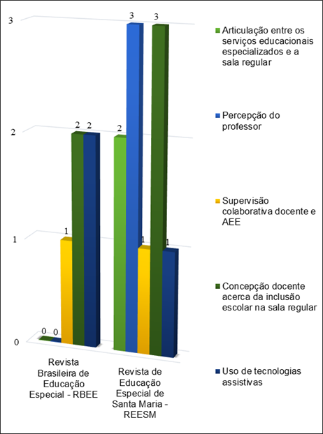 Três artigos (20%) representaram essa temática. Esses artigos avaliaram a percepção dos professores especialistas que atuam nas salas de recursos de escolas municipais sobre a inclusão escolar, tendo sido publicados, um em dupla, um em trio e um em grupo na REESM (REGANHAN; MANZINI, 2009; SANTOS; CORREIA; CRUZ-SANTOS, 2014; ZILLY et al, 2015).