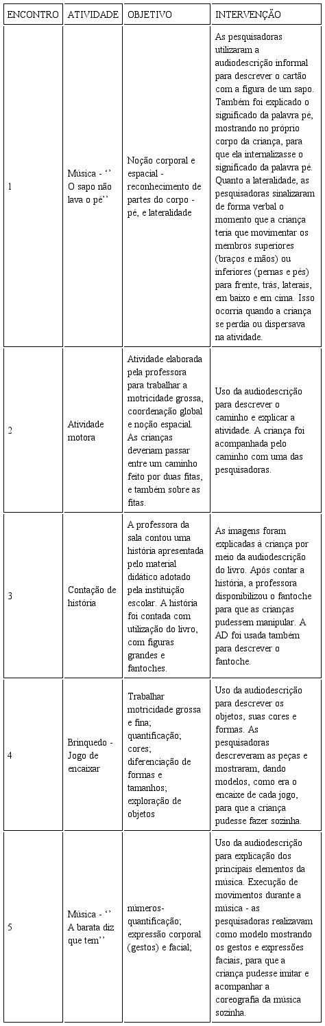 Considerando que o participante está frequentando a pré-escola e que a maioria das atividades realizadas nesta faixa etária é desenvolvida de forma lúdica por meio do brincar, nas sessões com a criança, a AD foi usada durante os momentos em que era necessária alguma explicação e imagens eram apresentadas à criança, como na contação de história, ou em atividades em que se trabalhava com música e eram usados cartões para apresentar às crianças algum vocábulo importante para o desenvolvimento da atividade. Nas atividades que envolviam música, foi utilizada a AD para descrever o cartão com as figuras relacionadas à música (animais, partes do corpo e expressões faciais). Nas atividades que envolviam o desenvolvimento motor e noção espacial, a AD foi utilizada para descrever o cenário da atividade e os objetos utilizados, como cores, formas e maneiras de encaixe.
