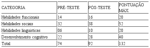 Os resultados foram obtidos a partir da comparação da aplicação do instrumento antes e após a intervenção. Cada uma das categorias (habilidades funcionais, sociais, linguísticas, desenvolvimento cognitivo) foi analisada separadamente, e o total de pontos obtidos em cada categoria, somados, como mostra a Tabela 1.