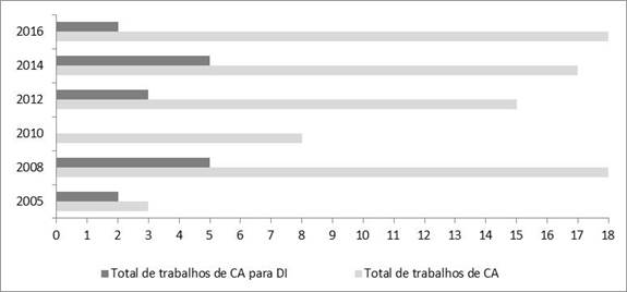 De 2012 até 2016 houve uma oscilação nos trabalhos para o público em questão, porém em 2016 de 18 trabalhos publicados sobre CA, apenas 2 trabalhos estudados abordavam a DI.