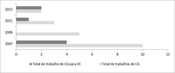 O gráfico 2 representa o total de trabalhos sobre CA e o total desses trabalhos que abordam o tema de DI no CBMEE realizado na Universidade de Londrina nos anais dos anos de 2007, 2009, 2011 e 2013.
