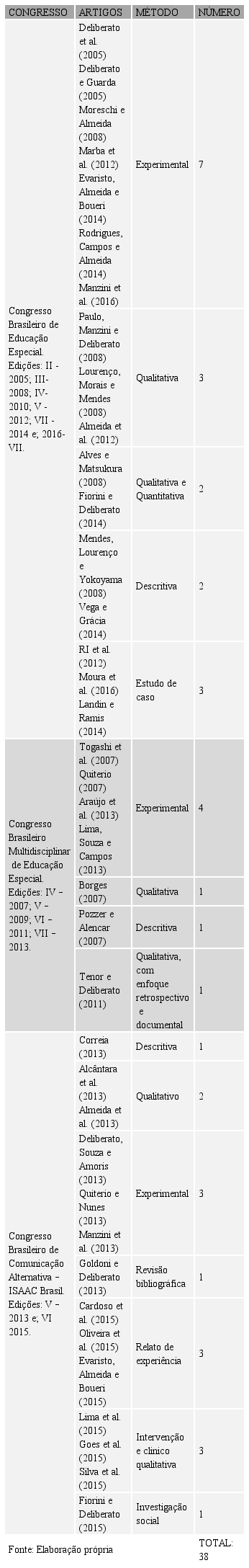 Com o levantamento bibliográfico dos anais disponíveis encontramos um total de 191 trabalhos sobre Comunicação Alternativa nos congressos analisados (Congresso Brasileiro de Educação Especial, Congresso Brasileiro Multidisciplinar de Educação Especial e Congresso Brasileiro de Comunicação Alternativa). Desses artigos encontrados, 38 trabalhos abordavam temas que se relacionavam com Deficiência Intelectual.