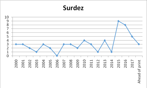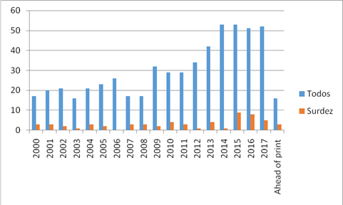 No gráfico 01 é apresentada uma comparação entre todos os artigos publicados por ano e os artigos que tratam da surdez. Em 2006 não houve nenhuma publicação referente ao tema em questão. Esse cenário mostra a representatividade do tema em todos os outros anos, em alguns de forma bem discreta em outros como 2015 e 2016 em maior número