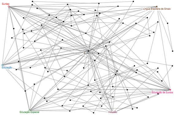 Para a construção da rede social com as palavras chaves contidas nos artigos realizamos algumas aproximações que consideramos oportunas. Palavras como “alunos surdos”, “aluno surdo”, “surdo” e “surdos”, que estão fazendo referência ao sujeito aprendente surdo foram substituídas por surdos, e assim fizemos com outras palavras, como “Libras” e “Língua Brasileira de Sinais”, optamos por utilizar a Língua Brasileira de Sinais. No entanto, para língua de sinais e língua brasileira de sinais, acreditamos que não é possível essa aglutinação, pois existem várias línguas de sinais onde a língua de sinais brasileira é apenas uma delas, dessa forma, para saber se o valor semântico é o mesmo, teríamos que ler na integra todos os artigos que possuíam essas palavras como uma das palavras-chave.