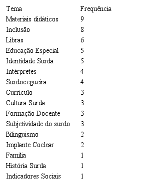 Outra consideração que merece destaque é a presença, bastante discreta de temas relacionados ao intérprete e sua atuação na educação de surdos, o olhar sobre esses sujeitos traz questões relativas à formação, prática e seu papel na educação de surdos. A presença desses sujeitos é muito importante uma vez que o professor pode não ser fluente em Libras, o que impede a comunicação com o surdo. Por outro lado, pode haver algumas interferências na comunicação, uma vez que o trabalho do interprete pode não ser transcrição literal para a Libras e o seu possível desconhecimento conceitual da disciplina pode gerar comunicações não tão fieis ao sentido que o professor quer enfatizar. Com isso, trata-se de um tema muito discutido atualmente em eventos da área[4], porém não se encontra presente de maneira significativa no corpus analisado, um fato que merece de investigações mais aprofundadas.