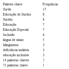Um total de 100 palavras-chave diferentes deram origem a uma rede social onde ficou evidente a representatividade da Surdez, do Surdo, da Educação Especial, da Inclusão, da Educação de Surdos e da Língua Brasileira de Sinais. O que nos leva a crer que a discussão sobre o cenário surdo perpassa por esses temas tanto na Educação Básica como no Ensino Superior, como foi sinalizado nos artigos selecionados. As frequências de palavras chaves na pesquisa são indicadas na tabela 2:
