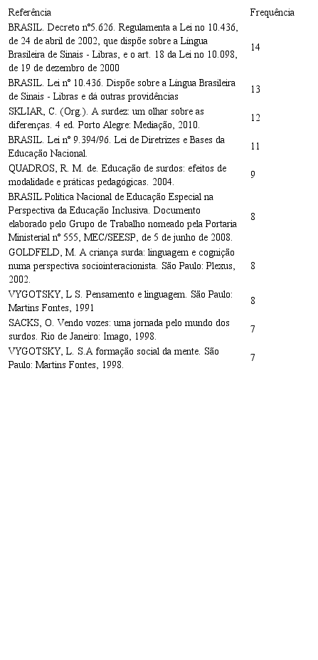 Ao realizar uma análise nas referências identificamos um total de 969 referências, sendo possível percebe que as obras mais citadas são de autores que trabalham com questões referentes a linguagens são recorrentes. A legislação brasileira referente à inclusão, surdos e Libras também aparece com frequência. Autores que não tratam a surdez como deficiência são os mais citados. Dessa forma, percebe-se que o quadro de referências vai ao encontro da ideia de traçar um cenário em que a surdez é uma especificidade e deve ser encarada de forma a posicionar o sujeito surdo em discussões que envolvam aspectos sociais, históricos e culturais. ´