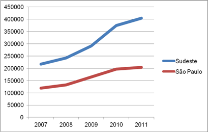 A figura 1 mostra a tendência das matrículas de alunos com deficiência[11] na educação básica na região Sudeste e no estado de São Paulo.