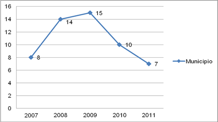 No município estudado, os dados de matrículas de alunos com deficiência no ensino regular variaram ano a ano, no período de 2007 a 2011, conforme mostra a figura 2.
