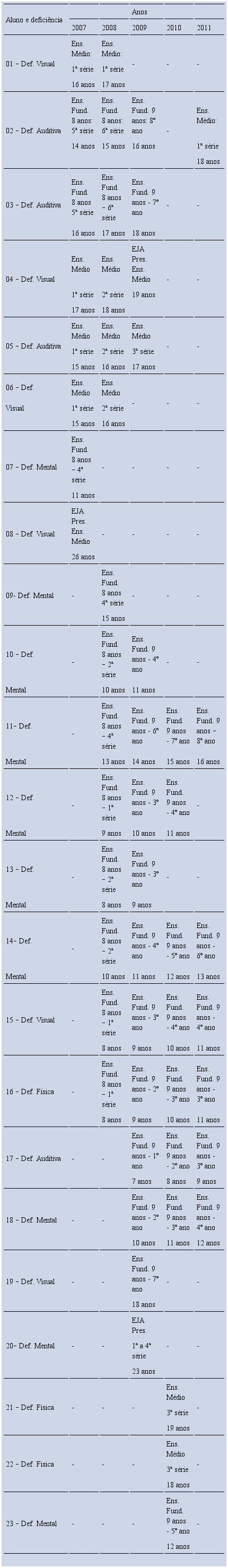 Para a execução desse trabalho, primeiro identificamos a quantidade de matrículas de alunos com deficiência no município. Em seguida, para traçar o fluxo escolar desses alunos, selecionamos o código de identificação de cada um e verificarmos, no período de 2007 a 2011, o movimento dessas matrículas, ou seja, analisou-se, ano a ano, em que série/etapa de ensino o aluno estava ou que deveria estar matriculado. Destacamos que esse processo de coleta de dados é minucioso, pois exige uma análise singular sobre a matrícula de cada aluno com deficiência no município em questão.