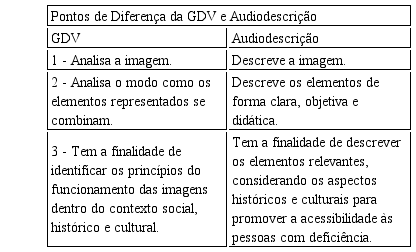 Foram encontradas pesquisas que utilizam a GDV para analisar possíveis relações entre texto visual e texto verbal no campo do letramento visual em EAD, (CARVALHO; ARAGÃO, 2015); evidenciar elementos constitutivos da imagem na construção de sentido em livros de língua estrangeira (ARAÚJO, 2011); para analisar o letramento visual e a exploração de textos multimodais (BARBOSA; ARAÚJO, 2014), entre outras. Na articulação com a AD, apenas uma pesquisa de mestrado que usa a GDV foi encontrada. A GDV, nesse contexto, é utilizada para a elaboração de proposta didático-pedagógica para professores que lidam com alunos com deficiência visual (GONZAGA, 2015). Portanto, até o momento, não foi encontrada qualquer pesquisa que proponha a incorporação dos princípios da GDV à elaboração das audiodescrições das imagens dos livros didáticos.