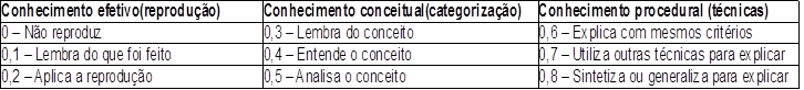 Com relação aos demais tópicos, para a definição de 0,3 ou 0,5, por exemplo, no conhecimento conceitual ou 0,6 ou 0,8 no conhecimento procedural, levou-se em conta os critérios apresentados na Tabela 1.
