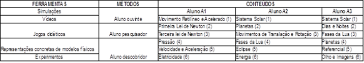 Para cada assunto trabalhado usou-se materiais distintos e métodos distintos de ensino e aprendizagem, como apresentado na Tabela 2. O método do aluno ouvinte está relacionado a aulas expositivas e tradicionais, onde o aluno apenas ouve, questiona e faz alguma atividade. O método do aluno pesquisador está relacionado ao aspecto de encontrar respostas através de questionamentos e postura independente para encontrar formas de explicar os fatos, já o método do aluno descobridor está relacionado ao fato de o aluno fazer parte das atividades, de ser o atuante em qualquer tarefa, ele precisa manipular e perceber o que é cada conceito, fazendo parte do aprendizado. O aluno descobridor e o aluno pesquisador, neste trabalho, são distintos porque considera-se que o aluno pesquisador tenha necessidade de maior estratégias para buscar respostas aos problemas, enquanto o aluno descobridor precisa de auxílio para as estratégias.