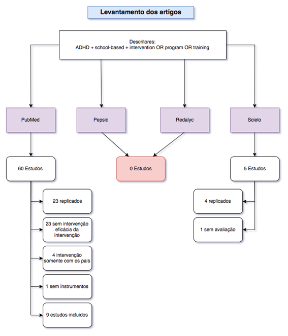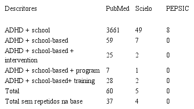 O total de artigos publicados com os termos TDAH e escola associados são 3661 no PubMed, 49 na Scielo e 8 na Pepsic, porém, quando substituímos escola por “school-based”, esses números caem para 59, sete e zero, respectivamente. Quando associamos TDAH “school-based” e “intervention” ou “training” ou “program”, foram encontrados 37 artigos no PubMed, quatro na Scielo e nenhum na PEPSIC, totalizando 41 artigos.