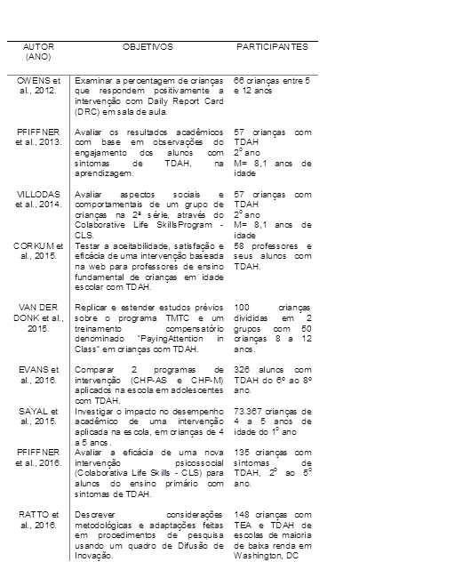 O objetivo deste estudo de revisão sistemática foi investigar estudos de intervenção baseados em evidências com crianças/adolescentes com TDAH, dentro do contexto escolar, no período entre 2012 a 2017. Devido à alta prevalência de TDAH e à cronicidade de seus sintomas, a busca por tratamentos para o manejo eficaz dos sintomas de TDAH tem sido uma grande preocupação entre pesquisadores nas últimas décadas (MIRANDA et al., 2006). Sabe-se que, em decorrência dessa cronicidade, intervenções no contexto escolar, assim como as intervenções farmacológicas, necessitam ser estendidas por um longo período de tempo antes que possam ser concluídas definitivamente (MIRANDA et al., 2006).