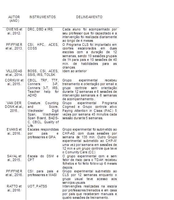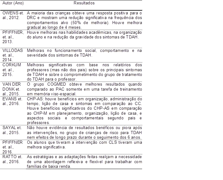 Apenas dois estudos, de Sayal e colaboradores (2015) e Ratto e colaboradores (2016), não apresentaram evidências de resultados benéficos ou piora após as intervenções; os demais sete estudos selecionados apresentaram evidências de resultados positivos, sendo que os estudos de Van Der Donk e colaboradores (2015) e Evans e colaboradores (2016) apresentaram melhoras apenas no aspecto comportamental, não apresentando melhoras no desempenho acadêmico. Os demais quatro trabalhos apresentaram evidências de resultados positivos em ambos os aspectos, comportamental e acadêmico, como: redução e melhoras nos sintomas de TDAH (PFIFFNER et al., 2013; VILLODAS et al., 2014; CORKUM et al., 2015; EVANS et al., 2016; PFIFFNER et al., 2016), melhoras nas habilidades acadêmicas (PFIFFNER et al., 2013; PFIFFNER et al., 2016) e sociais (VILLODAS et al., 2014; PFIFFNER et al., 2016), maior organização (EVANS et al., 2016; PFIFFNER et al., 2016), maior eficiência das funções executivas (VAN DER DONK et al., 2015) e redução significativa na frequência do comportamento-alvo (OWENS et al. 2012) (Quadro 4).
