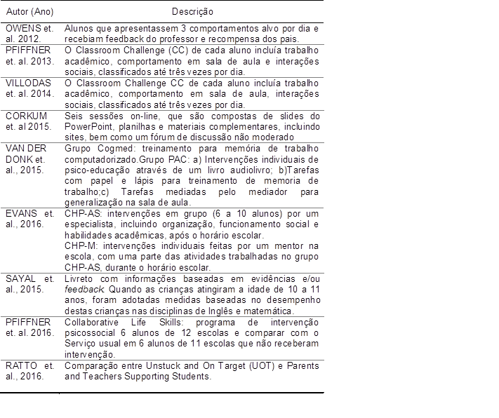 A revisão ampla dos estudos de intervenção em TDAH mostrou um grande número de pesquisas sendo direcionadas para a aplicação clínica. Entretanto, como o interesse desta pesquisa era de que as intervenções deveriam ocorrer dentro do contexto escolar, o número de estudos encontrados para esta revisão foi baixo (N=nove). É possível que esse número baixo esteja associado às dificuldades encontradas pelos pesquisadores quando desenvolvem estudos dentro de um contexto que conta com uma rede complexa de influências sociais, como o contexto escolar.