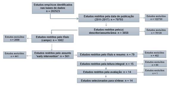 Com a inserção desta combinação nas bases de dados b-on, ERIC, Scopus e Scielo surgiram, no total, 202523 referências. Este número foi gradualmente reduzido à medida que os critérios de seleção foram aplicados. Desta forma, a restrição da data de publicação, entre 2011 e 2017, levou-nos a 79793 estudos. A seguir, este número foi reduzido pelo assunto/descritor/área resultando em 3658 estudos. Devido ao número ainda elevado, selecionamos pelo título (campo), unicamente, na base de dados b-on, obtendo 1002 estudos. Destes, voltámos a selecionar o assunto early intervention e obtivemos 561 estudos. Analisámos os títulos e, a seguir, lemos o resumo de cada estudo para perceber o tipo de estudo, o problema/objetivo da investigação e os seus participantes, pelo que obtivemos 79 estudos. Destes passámos para 15 estudos, através da sua leitura integral. Por último, avançámos com a avaliação dos estudos para percebermos se continha um enquadramento teórico explícito; a descrição clara da metodologia, dos resultados e das suas conclusões, conforme sugerido por Bryman (2012). Após esta avaliação, um estudo foi excluído devido aos seus resultados não incluírem informação sobre as práticas de IPI (MAS et al, 2016). Assim, o número final de estudos selecionados foi 14, em que oito resultaram da b-on (DUNST; BRUDER; ESPE-SHERWINDT, 2014; Fordham, Gibson, Bowes, 2011; Gavidia-Payne; Meddis; Mahar; 2015; Golubovic; Markovic; Perovic; 2015; Leite; Pereira, 2013; Pighini et al, 2014; Zheng et al, 2016; Ziviani et al, 2014); três da ERIC (Alotaibi; Almalki, 2016; Coogle; Guerette, Hanline, 2013; Thompson; Bruns, 2013); dois da Scopus (Bayhan; Sipal, 2011; Brandão; Craveirinha, 2011); e um da Scielo (Mayorga-Fernández; Madrid-Vivar; García-Martínez, 2015). As características dos estudos selecionados encontram-se apresentadas na tabela 1 (ver anexo).