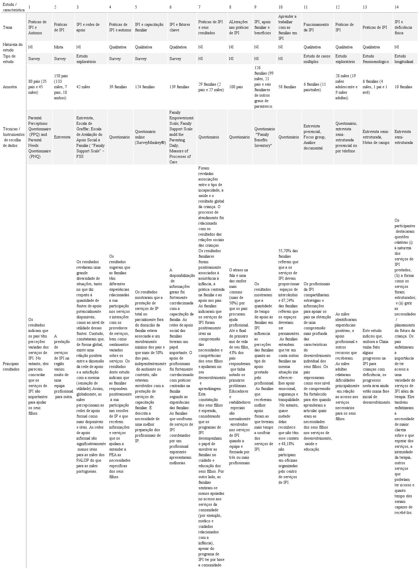 Para esta revisão analisou-se a metodologia e os resultados de 14 artigos publicados entre janeiro de 2011 e janeiro de 2017. Destes estudos, o objetivo de investigação mais proeminente baseou-se em conhecer as perceções das famílias apoiadas quanto às práticas de IPI. Assim, uns estudos identificaram percepções sobre os apoios que as famílias recebem e/ou as experiências com os profissionais; alguns estudos focaram os resultados e os benefícios das práticas de IPI e/ou da sua influência na vida das famílias; outros estudos abordaram a identificação das necessidades das famílias apoiadas em IPI; e um estudo focou as redes de apoio social das famílias.