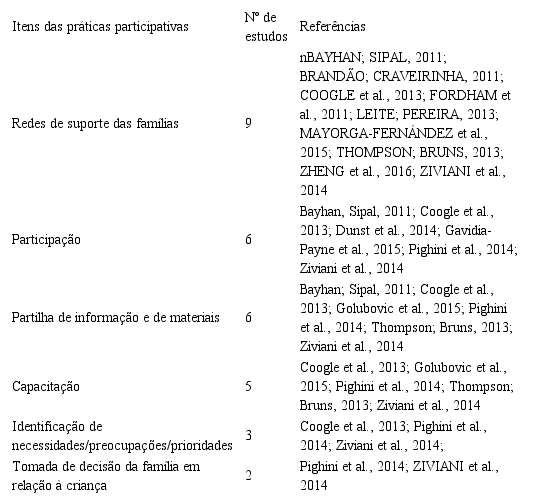 Em todos os estudos, as práticas participativas encontram-se espelhadas nas perspectivas das famílias, conforme os resultados. São estas práticas que distinguem uma abordagem centrada na família de outro tipo de abordagens. A seguir apresentamos na tabela 1 os itens relevantes destas práticas encontrados nos estudos pesquisados, por ordem de maior frequência.