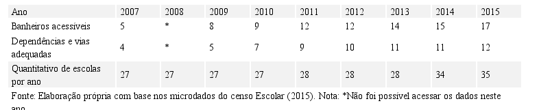 O município estudado foi beneficiado pelo PEA, desde 2007, e mobilizou recursos próprios para adaptações em escolas que não foram atendidas por esse programa. Dados coletados no Censo Escolar (2015) facultam ao governo federal a construção do indicador social “acessibilidade”. A Tabela 1 registra as adequações realizadas na rede municipal, a partir desse banco de dados.