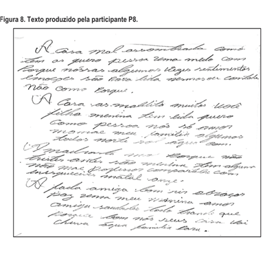 Apesar de fazer referência ao tema proposto, o texto escrito por P8 apresenta desconhecimento das regras de pontuação. No texto como um todo, a coesão sequencial é prejudicada, mas há alguns elementos gramaticais necessários à coesão referencial, o que indica uma tentativa de construção linguística.