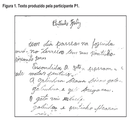 Constatou-se que, apesar da falta de alguns conectivos, o texto de P1 dá pistas para interpretações; porém, alguns segmentos posteriores acabam configurando problemas de sentido indefinido. É possível identificar protagonistas e um incidente envolvendo uma briga, embora o modo de construção e sequência dos enunciados não permita a composição de um encadeamento claro dos constituintes temáticos. Ainda, observou-se na produção escrita de P1 o pouco uso das convenções gramaticais da língua portuguesa. Além disso, sua construção omite parcialmente as pontuações e mostra sequências em que o primeiro termo da oração (“galinha”) se repete.