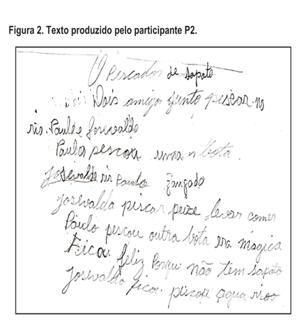 Alguns enunciados são interpretáveis. O participante P2 compôs o texto a partir das gravuras que parecem elementos, como “bota”, “peixe” e “pessoas pescando”. Embora o texto sugira imagens de uma situação de pescaria (peixe, pescar, vara) e alguns incidentes cômicos, várias dificuldades dificultam ou até suspendem a construção do sentido, como: a) as referências alternadas dos homens “Paulo e Josevaldo”; b) a inserção não esclarecida da bota mágica; c) e o sentido incompleto ou indefinido de vários enunciados.